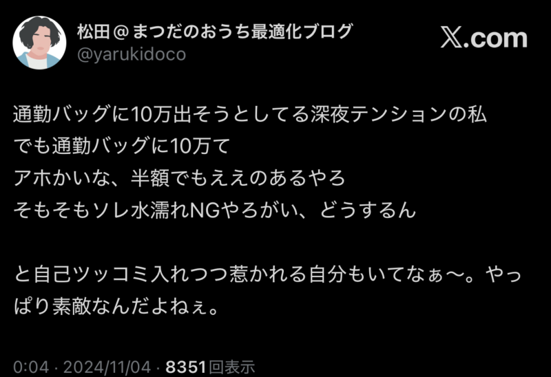 実は私、約1年前(2024年11月4日)からずっとこのバッグを買うべきか悩んでいました。
